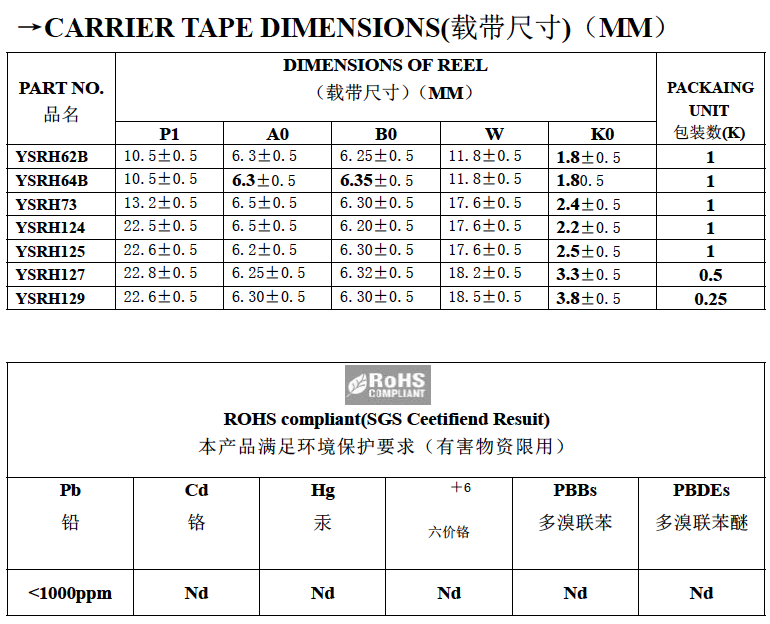 一系列感值: YSRH62B-2R9~YSRH62B-102 2.9UH~1000UH YSRH64B-2R9~YSRH64B-102 2.9UH~1000UH YSRH73-1R0M~YSRH73-102K 1.0UH~1000UH YSRH74-1R0M~YSRH74-102K 1.0UH~1000UH YSRH124-1R2M~YSRH124-102K 1.2UH~1000UH YSRH125-1R2M~YSRH125-102K 1.2UH~1000UH YSRH127-1R2M~YSRH127-102K 1.2UH~1000UH YSRH129-1R0M~YSRH129-152M 1.0UH~1500UH